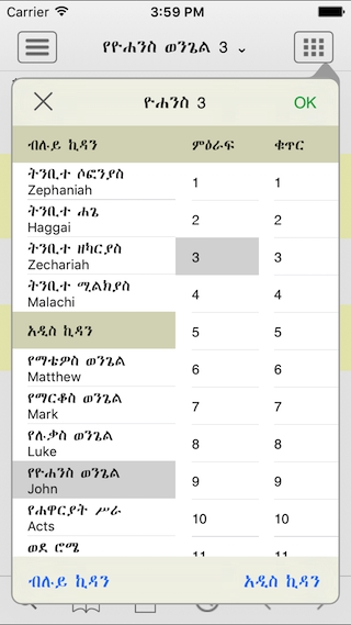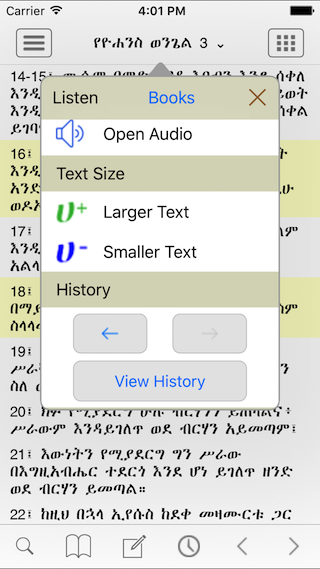You can find the iPhone/iPad/iPod versions of our Tigrigna, Geez and Amharic Bible apps at the App Store. They are absolutely free, and no advertisements. Search, Audio, Bookmarks, Notes, History, Smart Scrolling, KJV, WEB, ASV... See the screen shots at the bottom for more. For instruction about using the app, see the Help screen on the app.